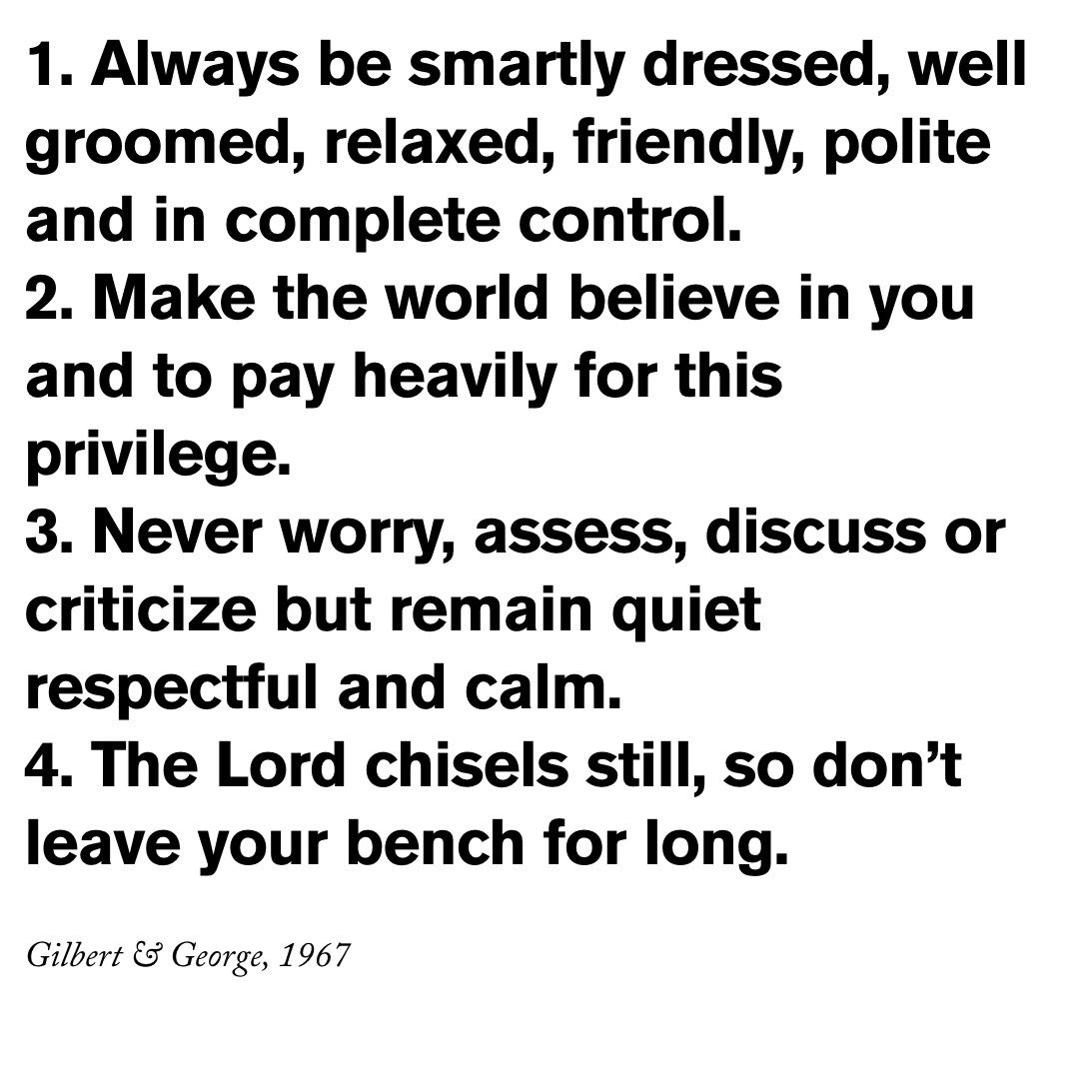 The Gilbert and George manifesto consists of only four rules. "Always be smartly dressed, well groomed, relaxed, friendly, polite and in complete control." is rule number one giving it a bit of importance over the others simply based of hierarchy. The idea of good behavior and smart form are typical of their morals and outward reputation, as they clearly value a formal appearance and demeanor. Making the world "believe in you" seems to place value in self worth and understanding that your mere existence is a privilege to the world which explains the next rule of "never worry assess, discuss or criticize but remain quiet, respectful and calm." The last rule of the manifesto seems less literal than the others, with the idea of leaving your bench maybe relating to giving up on your ideas or not believing the pathway that you have chosen. Overall this manifesto seems very based around self care and self confidence, which is a refreshing approach as it feels more personal and sincere to the people it will be communicating to.
